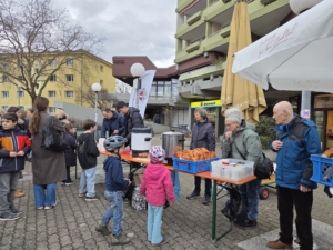 Auf dem Betzenhauser Torplatz wurden die Kinder vom Marktverein zusätzlich mit heißen Würstchen im Brot beschenkt, die Herr Metzgermeister Rückert eigenhändig verteilte. Herr Rückert betreibt den Stand auf dem Bauernmarkt.