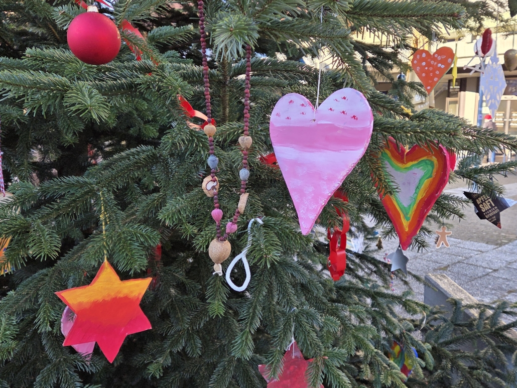 Mit Begeisterung und großem Eifer schmückten zahlreiche Kinder die beiden großen Weihnachtsbäume. Selbstgebastelte Sterne, Herzen und Kugeln sowie viele weitere kreative Schmuckstücke verwandelten die Bäume in leuchtende Kunstwerke. Tatkräftig unterstützt von den Erwachsenen entstanden so zwei prächtig geschmückte Weihnachtsbäume, die unseren Stadtteil in der Adventszeit erstrahlt haben.